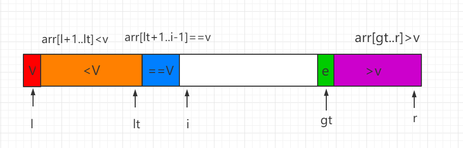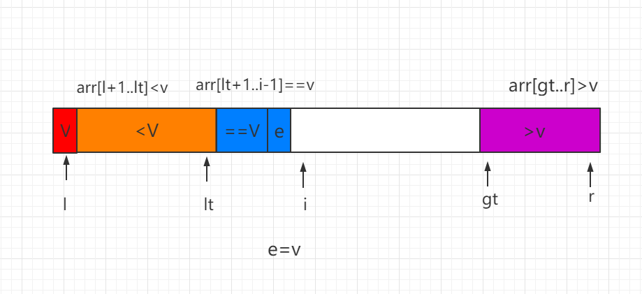 (2)当前处理元素 e<v,e 和等于 V 区间的第一个位置数值进行交换,同时索引 lt 和 i 都向后移动一位