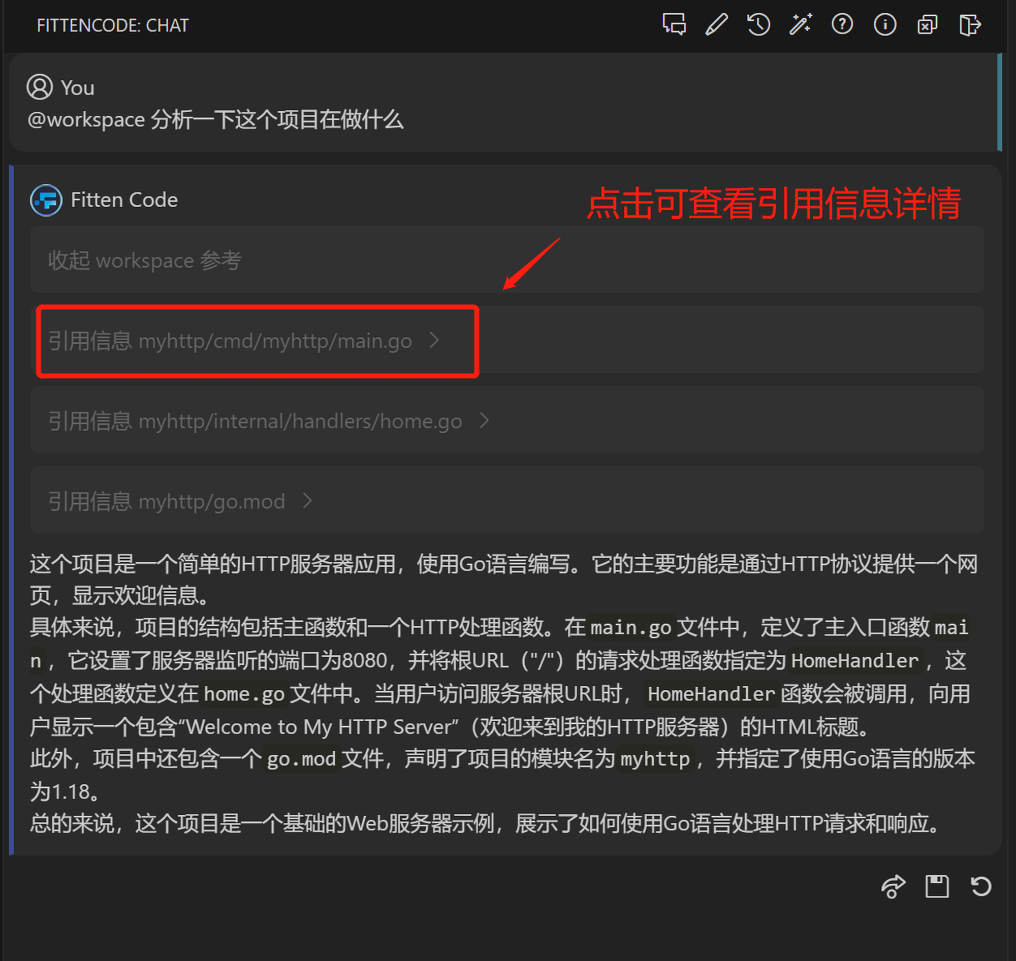 Fitten Code 会将文件拆成多个部分进行分析和引用,用户点击展开workspace参考点击引用信息:便可看到引用详情,下图是workspace所参考的文件:
