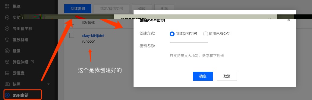 3、在使用腾讯云服务器前,我们需要先创建一个 SSH 密钥,点击左侧的 SSH 密钥 (使用密钥登录比密码更安全):
