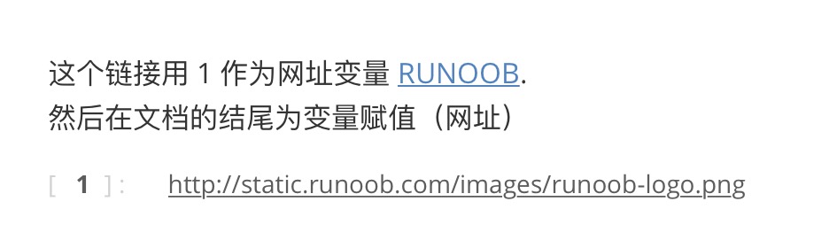 这个链接用 1 作为网址变量 [RUNOOB][1]. 然后在文档的结尾为变量赋值(网址) [1]: ../static/picture/logo.png