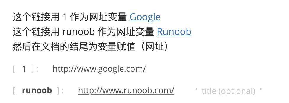 这个链接用 1 作为网址变量 [Google][1] 这个链接用 runoob 作为网址变量 [Runoob][runoob] 然后在文档的结尾为变量赋值(网址) [1]: http://www.google.com/ [runoob]: /