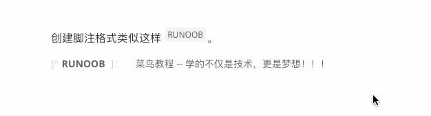 创建脚注格式类似这样 [^RUNOOB]。 [^RUNOOB]: 小白教程 -- 学的不仅是技术,更是梦想!!!