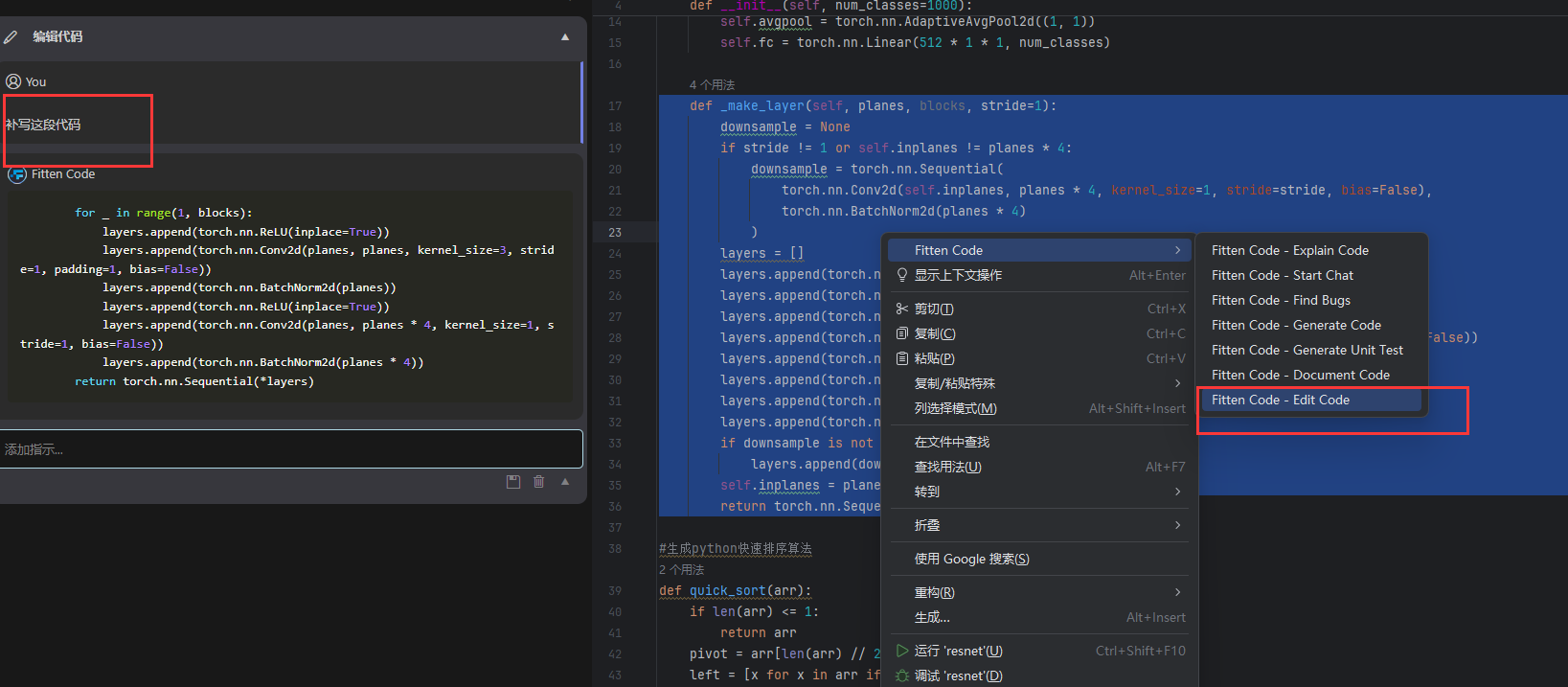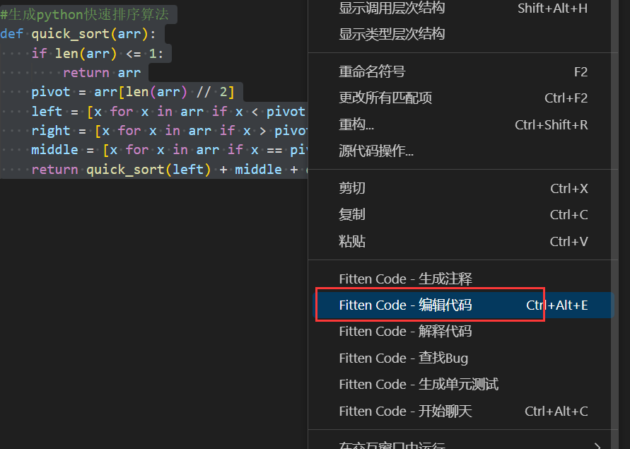 Fitten Code可根据用户指示对选定的代码块进行编辑。通过选中代码段右键选择 "Fitten Code – 编辑代码" ,如下图所示: