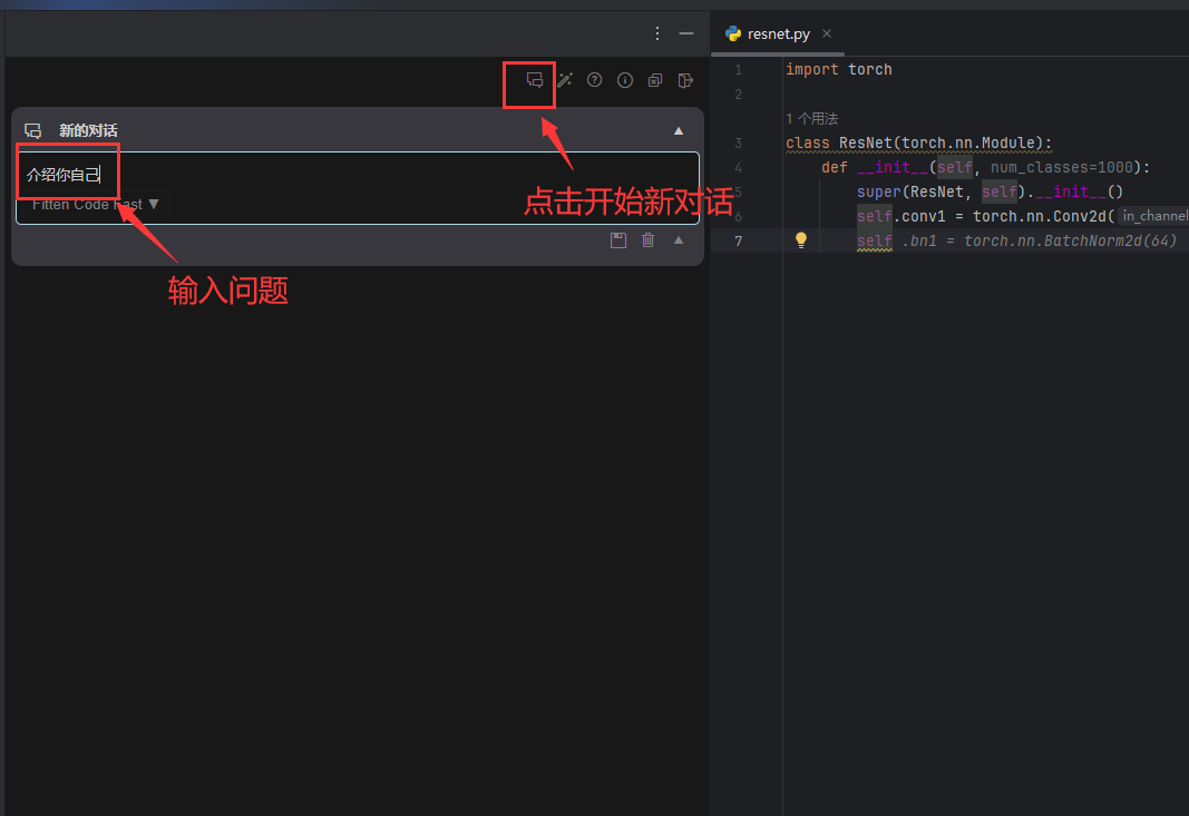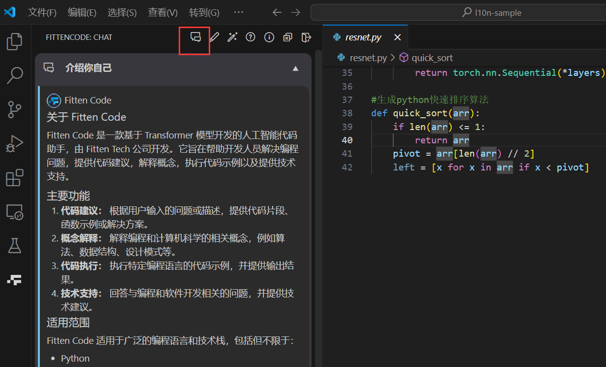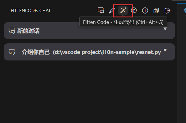 用户可通过点击左上角工具栏中的Fitten Code – 开始新对话打开对话窗口进行对话: