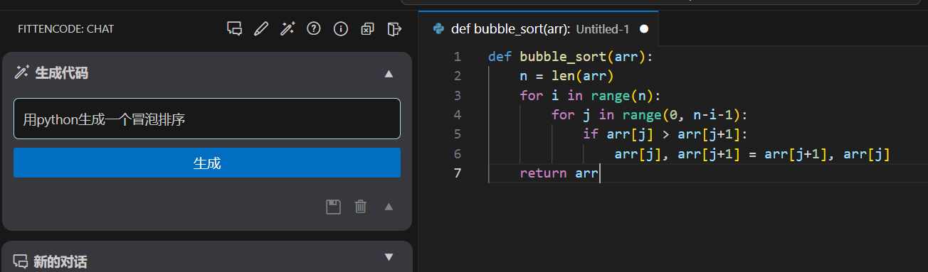 可在左侧 Fitten Code 工具栏中选择 "Fitten Code - 生成代码" ,然后在输入框中输入指令即可生成代码: