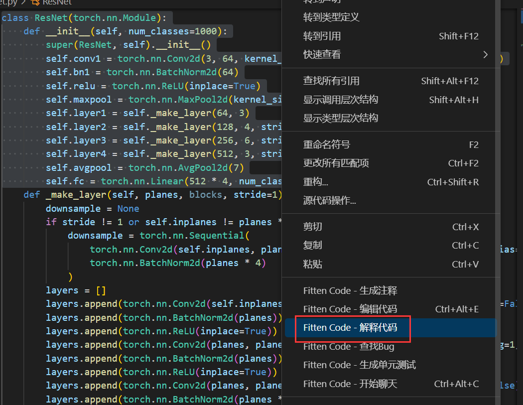 Fitten Code 可以对一段代码进行解释,可以通过选中代码段然后右键选择 "Fitten Code – 解释代码" 进行解释,如下图所示:
