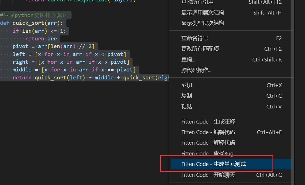 Fitten Code 拥有自动生成单元测试的功能,可以根据代码自动产生相应的测试用例,提高代码质量和可靠性。通过选中代码段后右键选择 "Fitten Code – 生成单元测试" 来实现,如下图所示:
