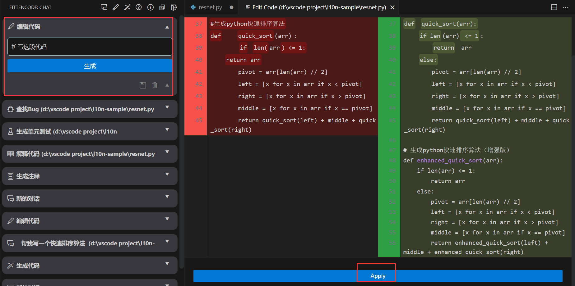 随后,用户可在输入框中输入指示,Fitten Code 会新建一个窗口对比显示更改前和更改后的内容,用户可通过点击 "Apply" 应用更改,如下图所示: