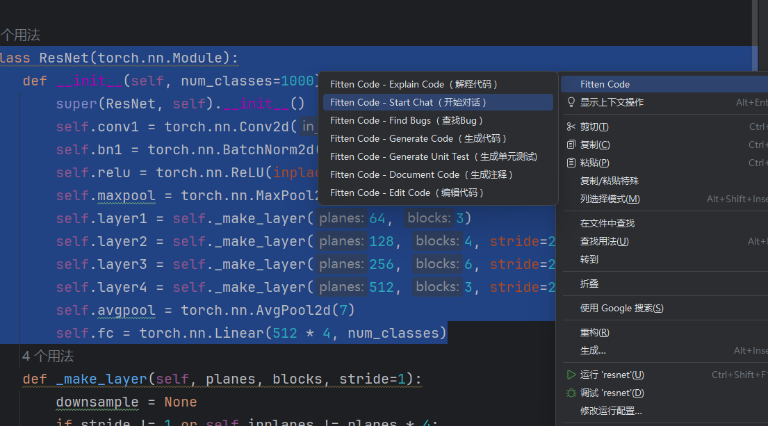 当选中代码段再通过右键的开始聊天功能进行对话时,Fitten Code 会自动引用所选中的代码段,此时可直接针对该代码段进行问询等操作: