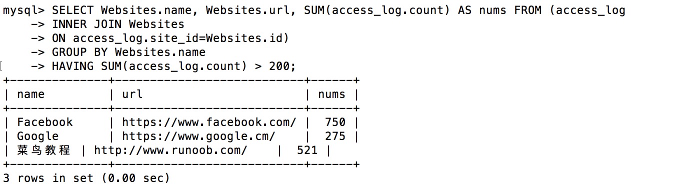 +----+--------------+---------------------------+-------+---------+ | id | name | url | alexa | country | +----+--------------+---------------------------+-------+---------+ | 1 | Google | https://www.google.cm/ | 1 | USA | | 2 | 淘宝 | https://www.taobao.com/ | 13 | CN | | 3 | 小白教程 | / | 4689 | CN | | 4 | 微博 | http://weibo.com/ | 20 | CN | | 5 | Facebook | https://www.facebook.com/ | 3 | USA | | 7 | stackoverflow | http://stackoverflow.com/ | 0 | IND | +----+---------------+---------------------------+-------+---------+