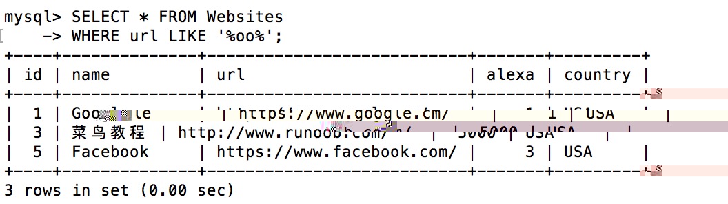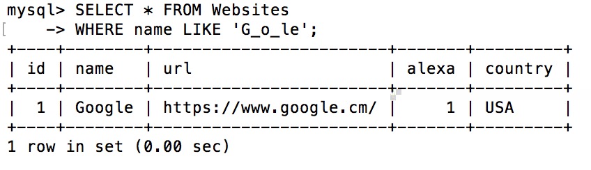 mysql> SELECT * FROM Websites; +----+---------------+---------------------------+-------+---------+ | id | name | url | alexa | country | +----+---------------+---------------------------+-------+---------+ | 1 | Google | https://www.google.cm/ | 1 | USA | | 2 | 淘宝 | https://www.taobao.com/ | 13 | CN | | 3 | 小白教程 | / | 5000 | USA | | 4 | 微博 | http://weibo.com/ | 20 | CN | | 5 | Facebook | https://www.facebook.com/ | 3 | USA | | 7 | stackoverflow | http://stackoverflow.com/ | 0 | IND | +----+---------------+---------------------------+-------+---------+