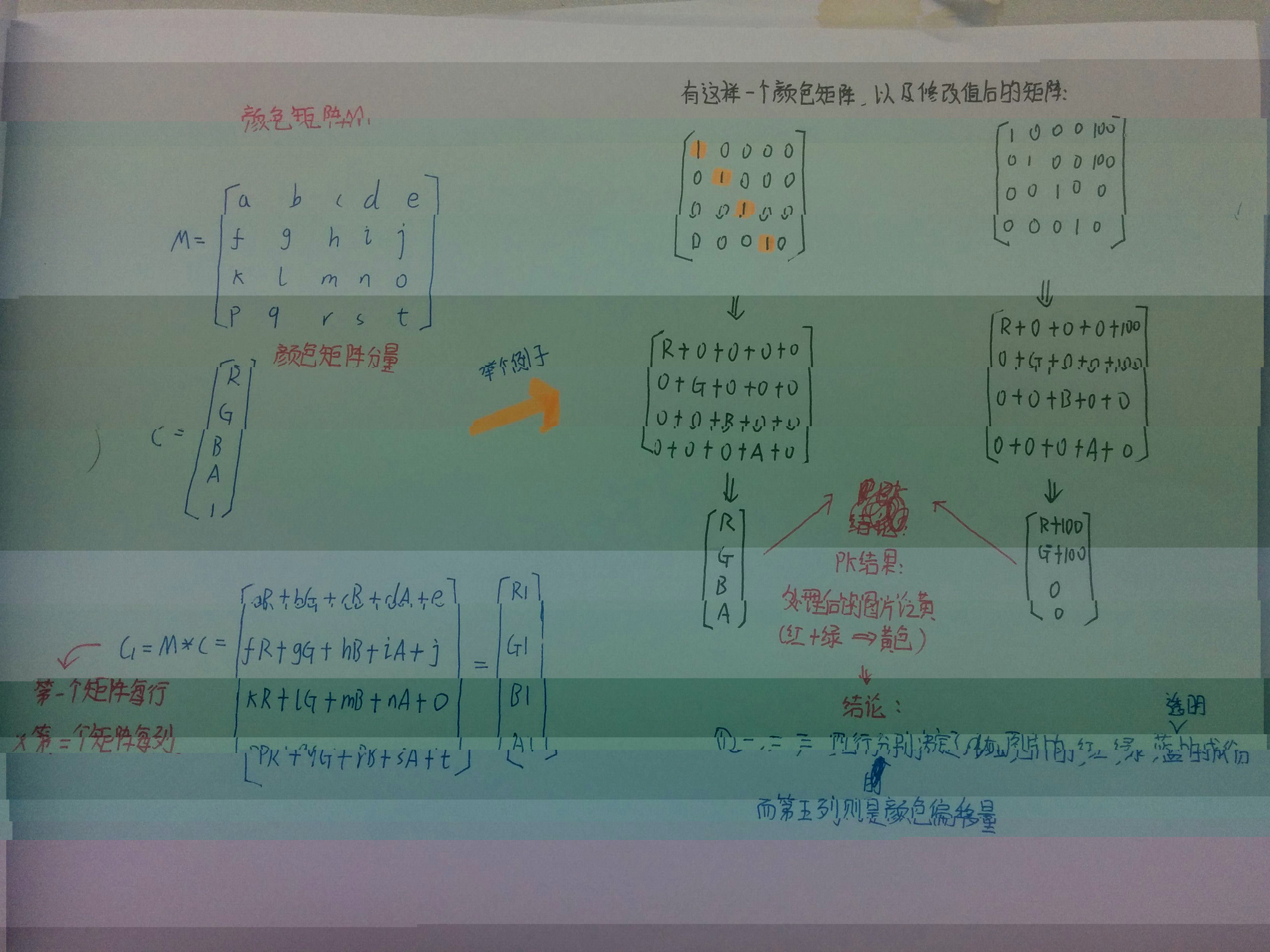 如题,颜色矩阵(4 * 5),我们可以修改矩阵中的值,来实现黑白照,泛黄老照片,高对比度等效果! 手撕颜色矩阵解释图如下: