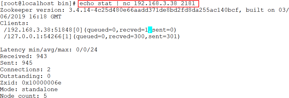 stat 命令用于查看 zk 的状态信息,实例如下: